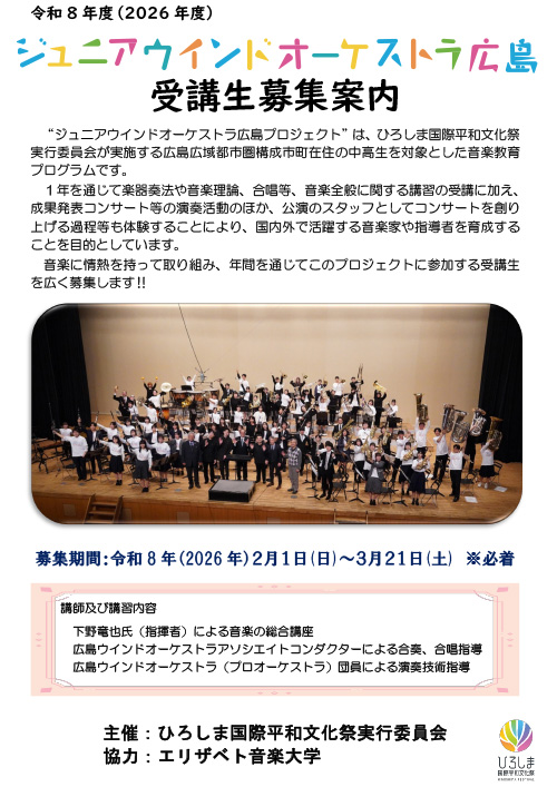“ジュニアウインドオーケストラ広島プロジェクト”は、ひろしま国際平和文化祭実行委員会が実施する広島広域都市圏構成市町在住の中高生を対象とした音楽教育プログラムです。