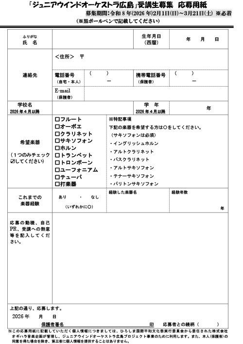 株式会社 オギハラ音楽企画「ジュニアウインドオーケストラ広島 受講生募集」担当 荻原 宛